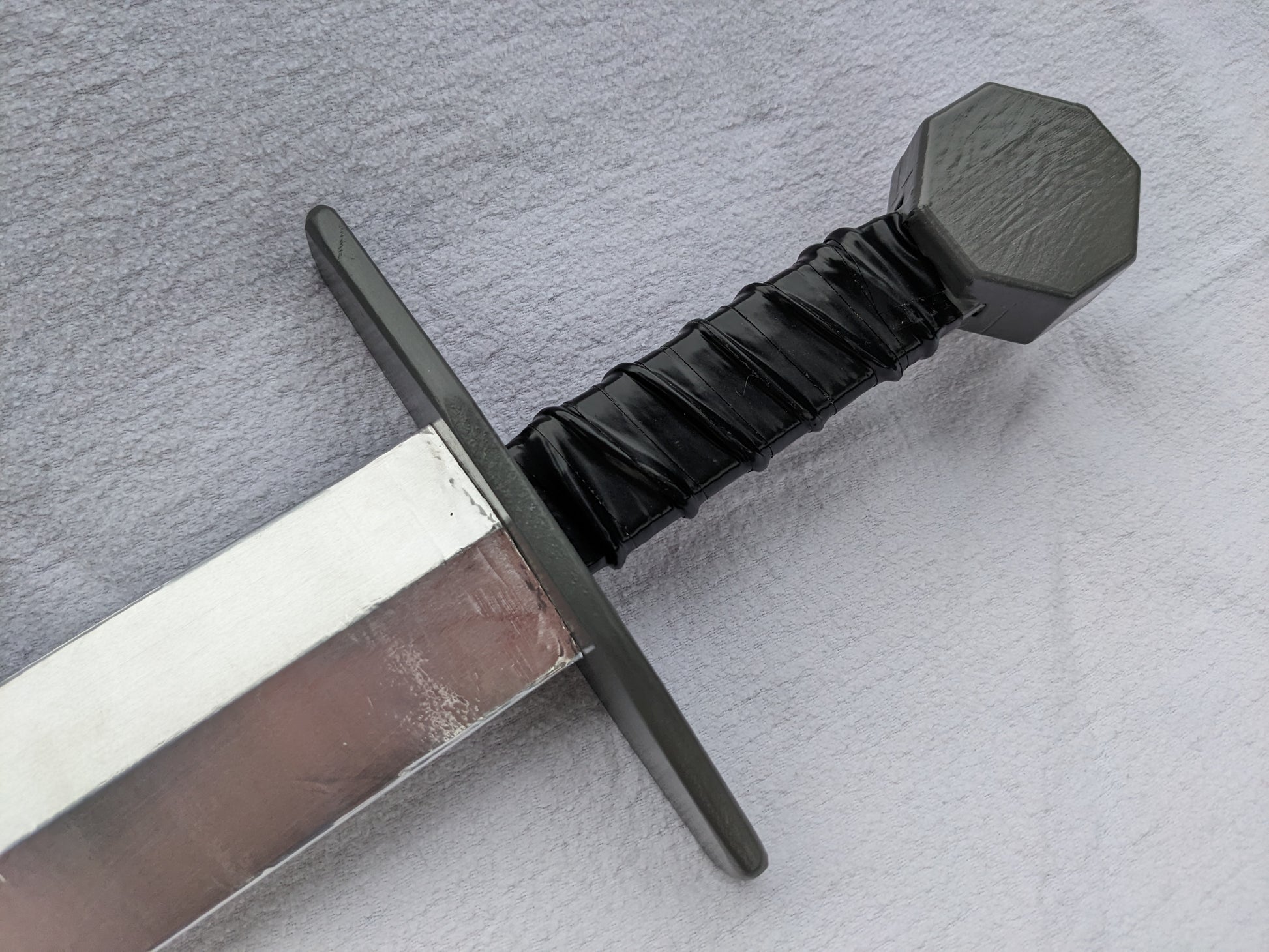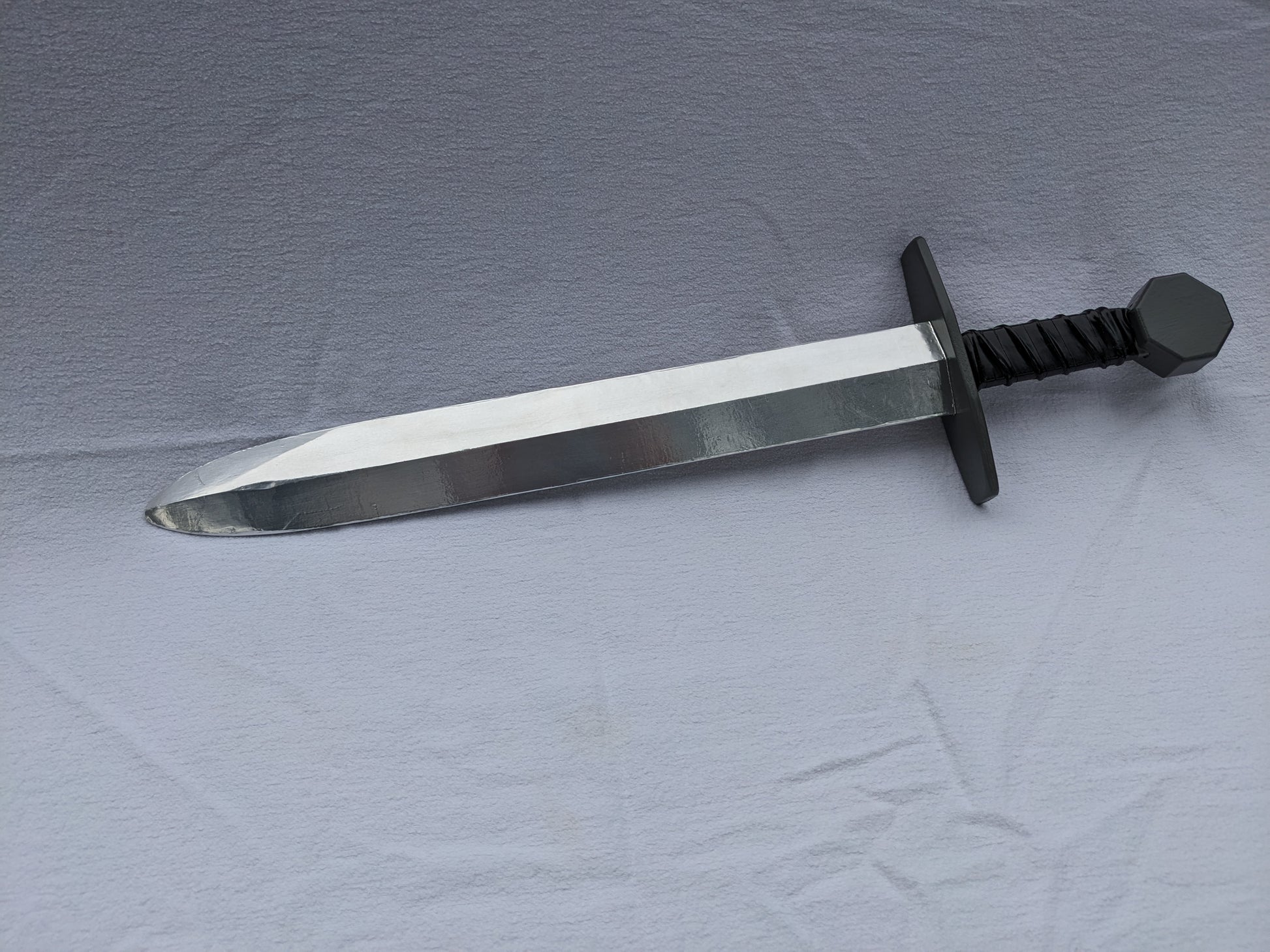 Handmade of solid hardwood, this sword features a steel gray cross guard and octagonal pommel, as well as a padded grip. The wooden blade has been "metallized" with a thin aluminum foil covering, giving it a shiny surface and realistic glint. The overall length of the sword is 25".