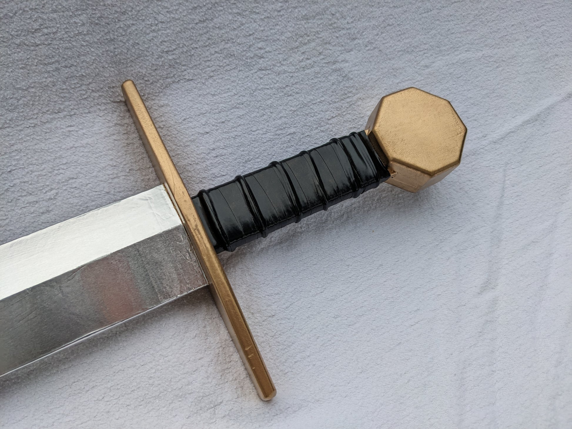 Handmade of solid hardwood, this sword features a gold-colored cross guard and octagonal pommel, as well as a padded grip. The wooden blade has been "metallized" with a thin aluminum foil covering, giving it a shiny surface and realistic glint. The overall length of the sword is 30".