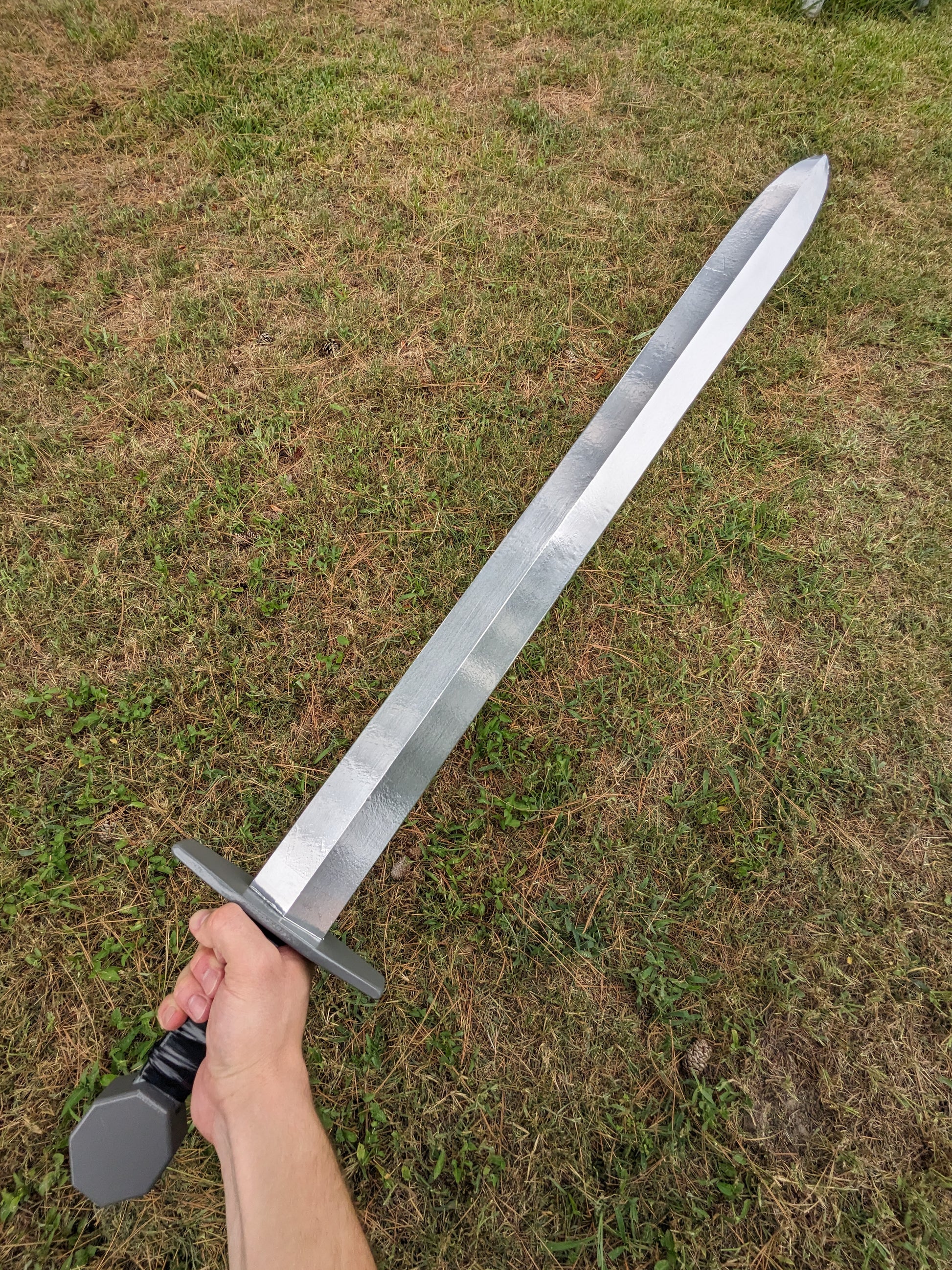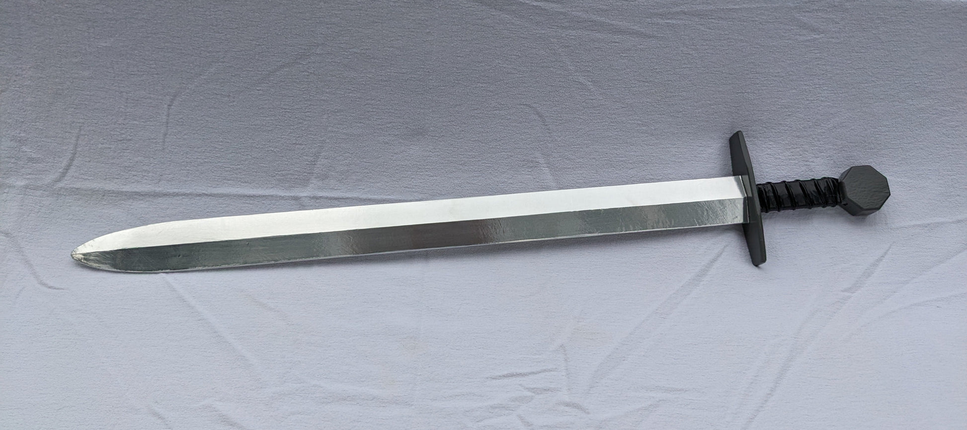 Handmade of solid hardwood, this sword features a steel gray cross guard and octagonal pommel, as well as a padded grip. The wooden blade has been "metallized" with a thin aluminum foil covering, giving it a shiny surface and realistic glint. The overall length of the sword is 36".